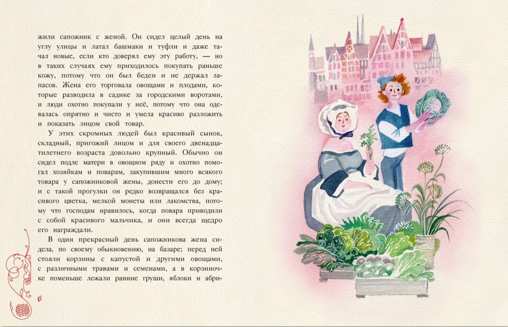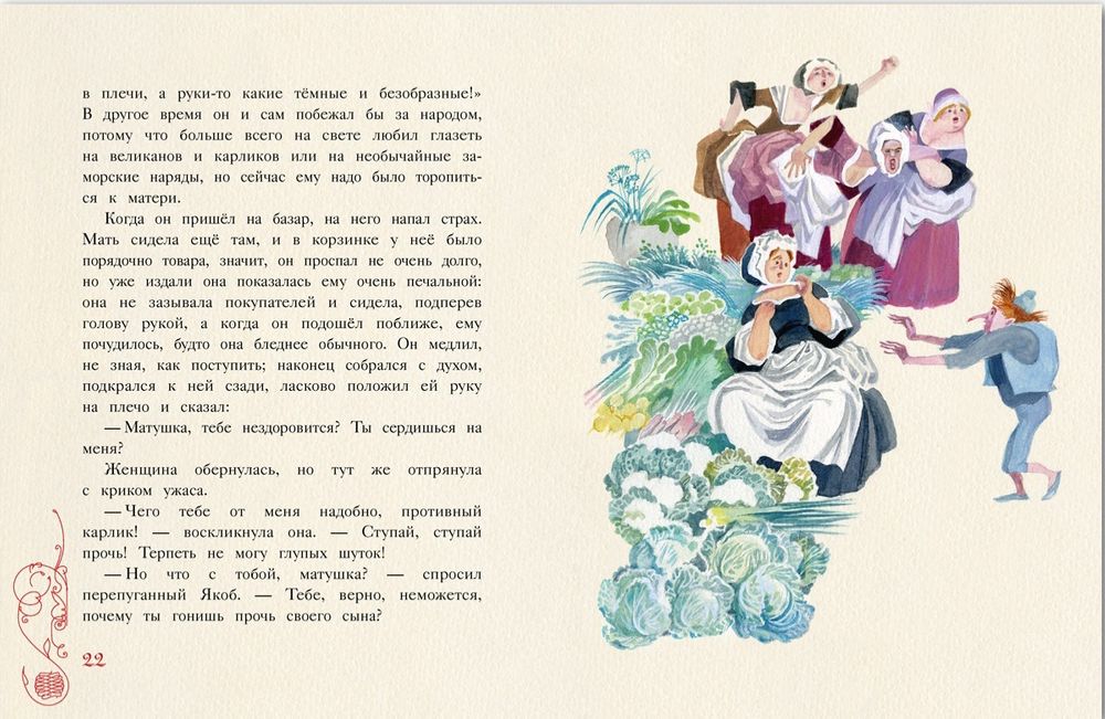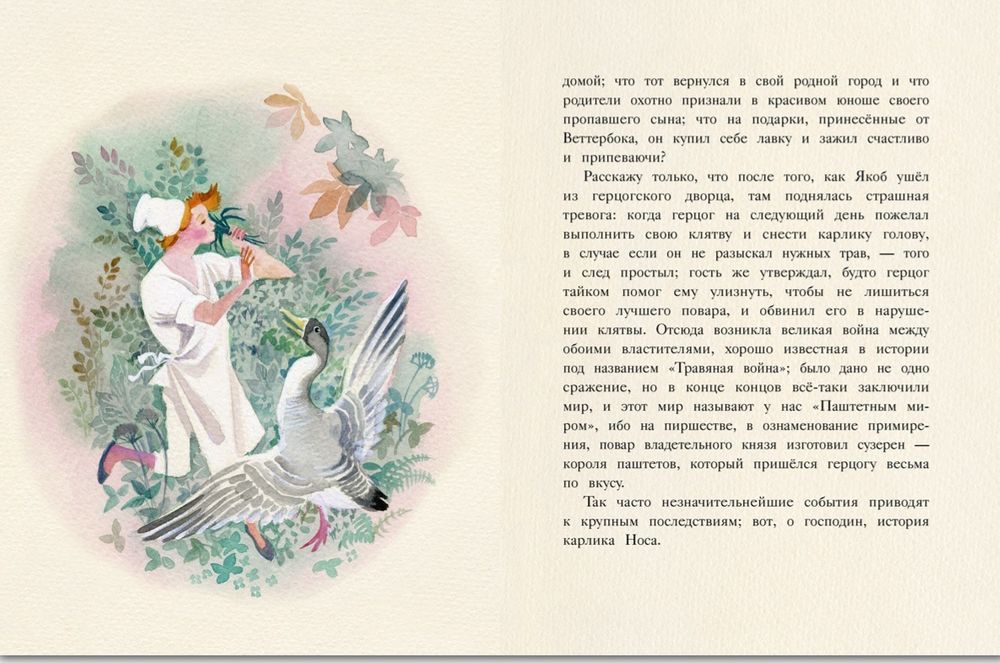 Сказка «Карлик Нос» - о хорошеньком избалованном мальчишке, который насмеялся над уродством старого человека и в результате сам стал уродцем, над которым смеются окружающие. Поэтично и трогательно сказку проиллюстрировала известный художник Ника Гольц.