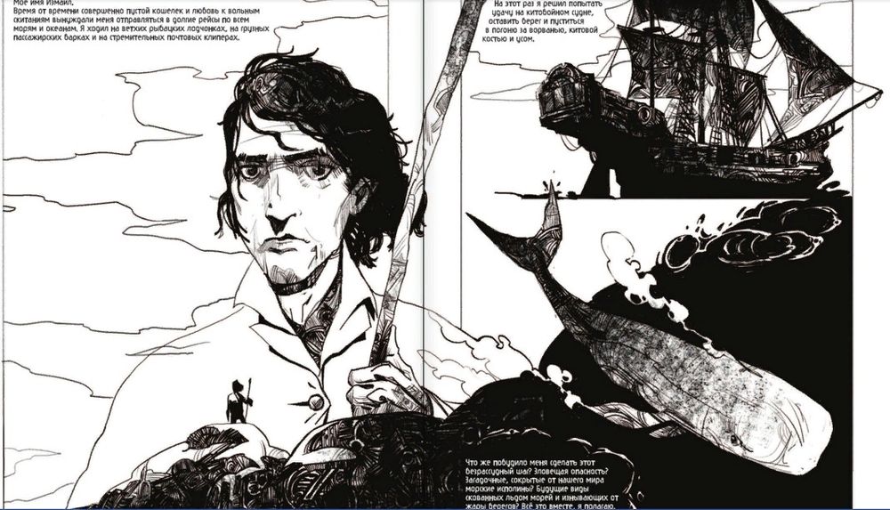 Брызги соленой воды на лице, скрежет мачт и порывы ледяного ветра врываются в действительность со страниц графического романа. "Моби Дик" - это погружение в самый настоящий океан с неизмеримой глубиной, суровым ветром, штормами и периодами обманчивого спокойствия.