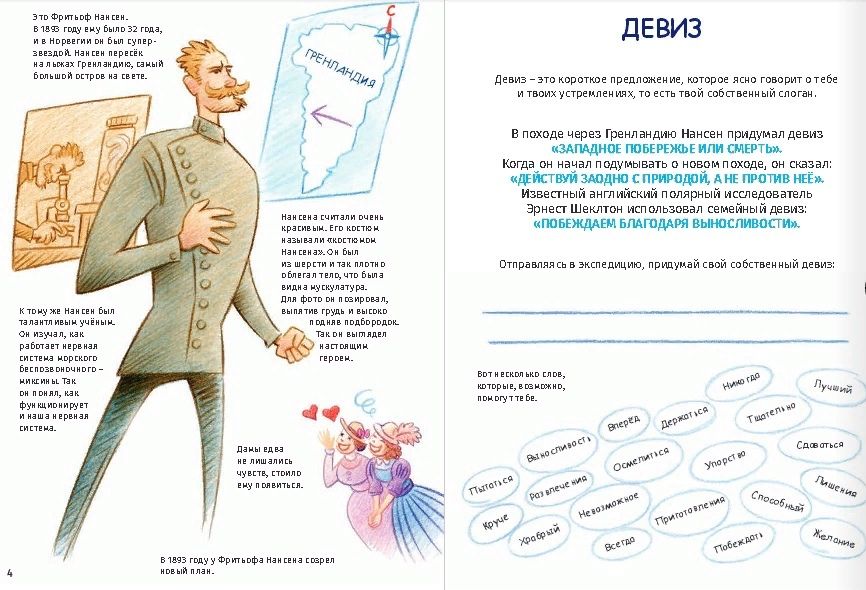 На примере одной из самых героических страниц в истории освоения Арктики - трехлетней экспедиции Фритьофа Нансена к Северному полюсу на шхуне «Фрам», автор дает практические и полезные советы, которые пригодятся в походе. Книга удивительно просто, весело и интересно рассказывает детям о сложных географических понятиях, о животном мире и климате Заполярья, как подготовить экспедицию к Северному полюсу. В ней много практических заданий, лабиринты и кроссворды, которые с интересом можно выполнять всей семьей.