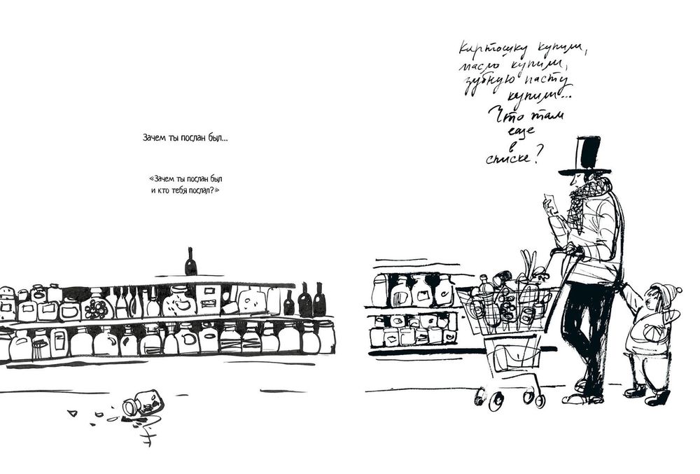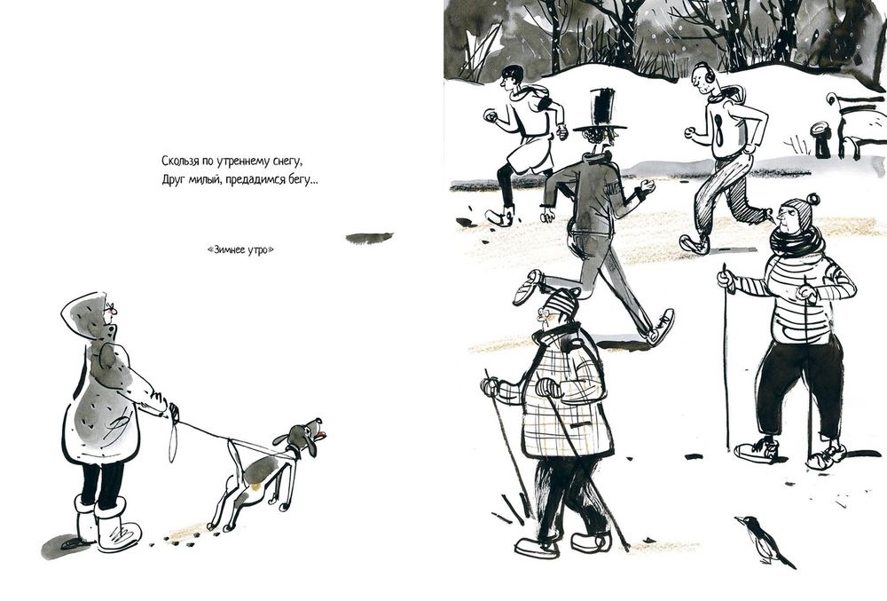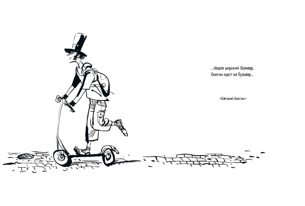 Как бы жил Пушкин, окажись он нашим современником? Да вот как: делал бы селфи и гонял бы на скейтборде, покупал бы продукты по списку в супермаркете и зажигал бы на рок-концертах. С Гоголем обсуждал бы сюжеты в баре, а бессмертные строки выстукивал бы на клавиатуре ноутбука. Таким Пушкин предстает в серии веселых рисунков Евгении Двоскиной, каждый из которых сопровождается цитатой из произведений самого классика.