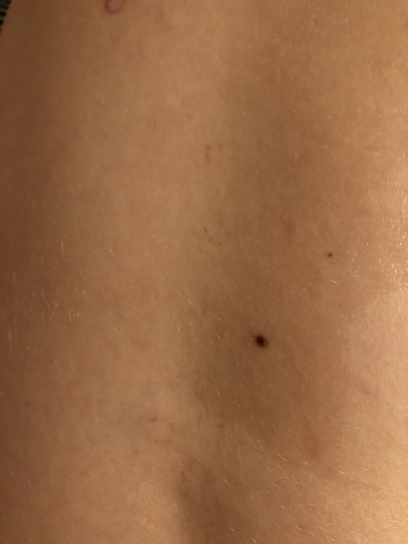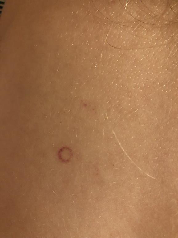 ДерматологияДевочки перед сном обнаружила вот такие кружочки. Как будто капилляры внутри полопались но четко ровным кружком. Одно яркое прям, а вниз почти вдоль позвоночника ещё несколько но как будто внутри кожи. Может кто встречал такое?