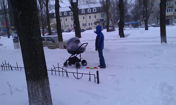 Мужу приспичило! Сказала что сам будет толкать коляску, вокруг дома раз обошли ели-ели, во дворе постояли- и все, полчаса и замерзли