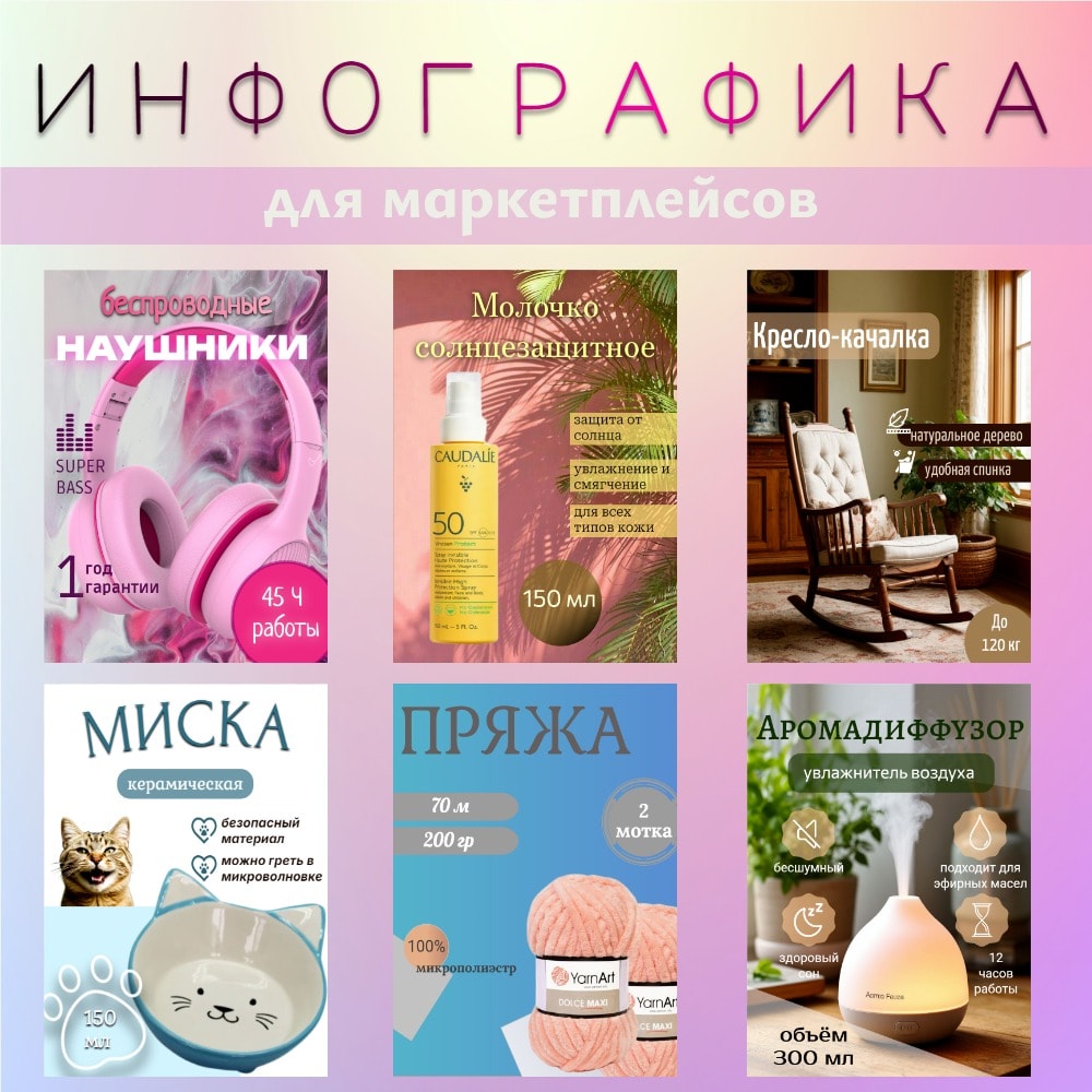 ДосугЗаинтересовалась инфографикой для маркетплейсов. Соцсети кишат различными курсами по обучению дизайнеров карточек для Wb и Ozon. Я решила просто попробовать сразу с практики - очень скептически отношусь к этим курсам.