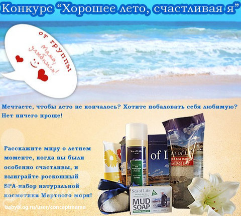 Мечтаете, чтобы лето не кончалось? Хотите побаловать себя любимую? Нет ничего проще! С 20 августа участвуйте в позитивном конкурсе "Хорошее лето, счастливая я!" и выиграйте приз - роскошный набор натуральной косметики Мертвого моря!