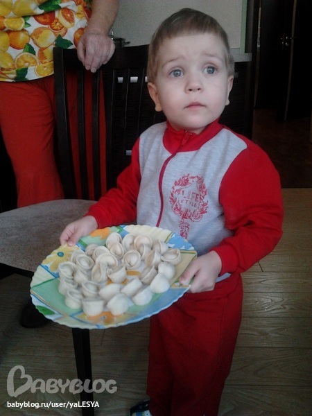 Да уж, взгляд очень выразительный)) молодцы вы! а я делаю наоборот, с теплой водичкой и добавляю масла растительного ложку, тоже очень эластичное получается тесто! и наверно вкусное, потому что сын в пельменях и варениках объедает только тесто, начинку брезгливо отодвигает :)