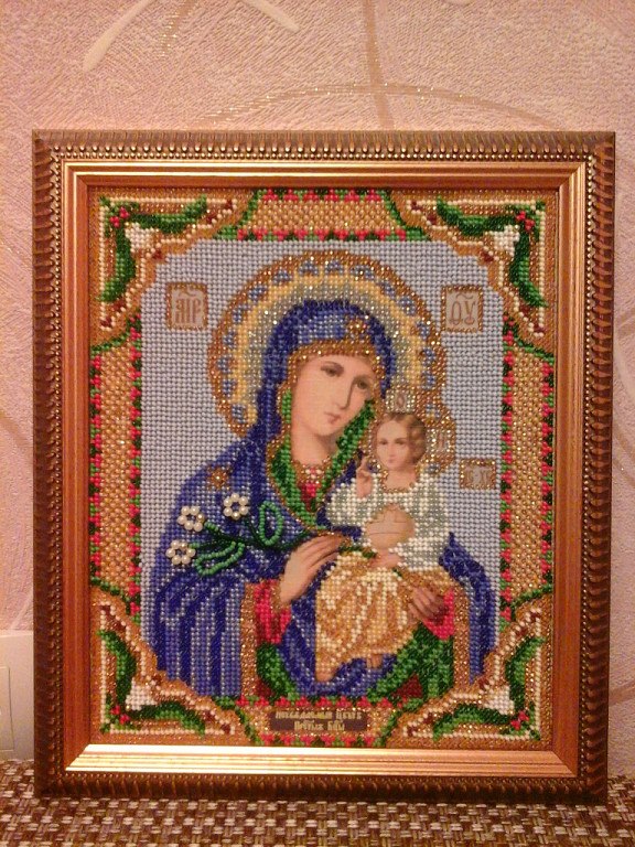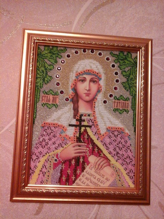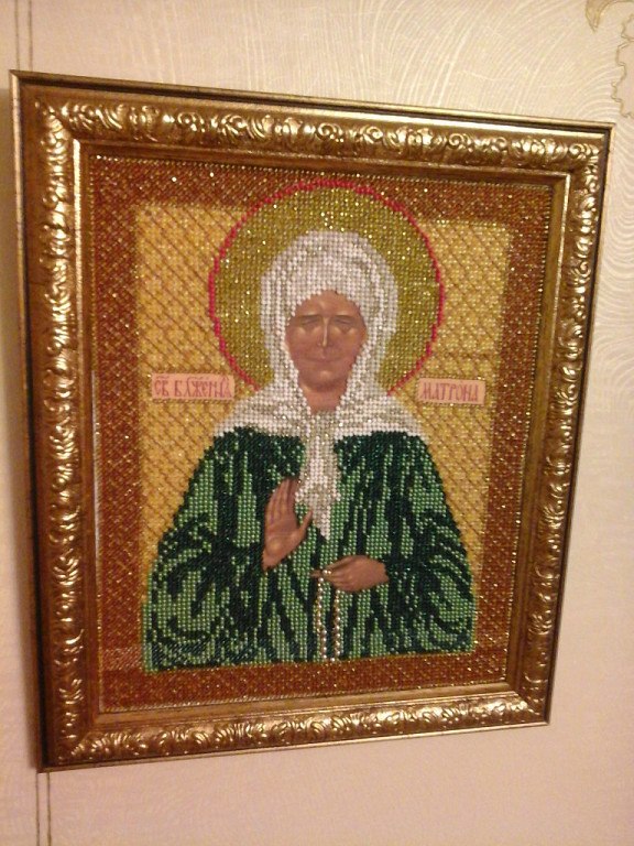 Выгивать биссером начала будучи беременной, на 3 мес, лежала часто на сохранении.....вышиоа первую Матрюну. Понравилось. После вышилаинам семейную икону Богородицы. Ролилась Таня. На год вышала иклну дочки Святой Татианы. Николая Чудотворца вышила в подарок свекрови (она у нас живет в Архангельске). Сейчас вышиваю Богородицу Казанскую, вышиваю и молю о здравии нах деток.
