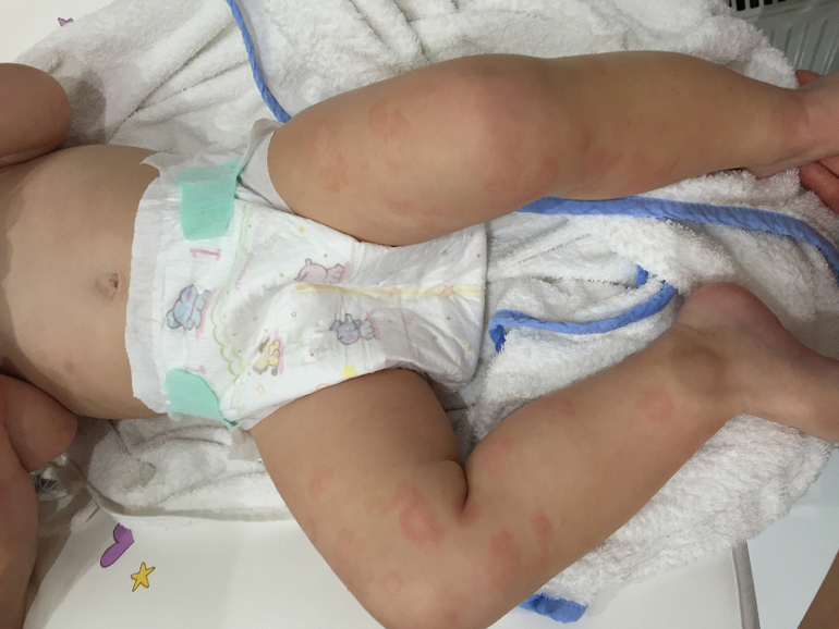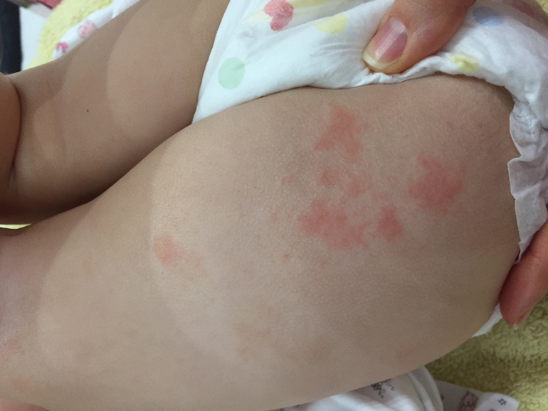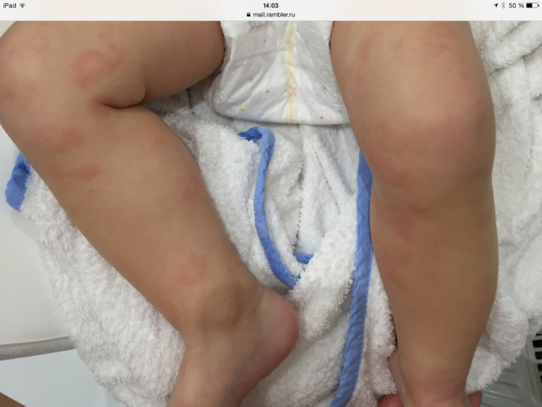 Ребенку 1.3 года. Сыпь появилась 2 месяца назад. Началось все с маленького пятна на бедре, сейчас по всем ногам крупные пятна, на руках, чуть на животе. Сыпь продолжает увеличиваться, пятна становятся крупнее и крупнее. Появление первого пятна совпало с: