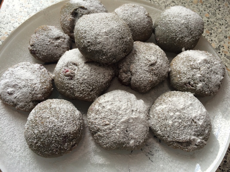 Сироп я делала сама. Взяла 100 гр ягод (замороженную бруснику), засыпала 100 гр сахара и прокипятила минут 5. Затем готовый сироп засыпала мукой с содой, все перемешала и из получившегося теста скатала небольшие лепешки. Отправила их в духовку на 180 гр минут на 10. Готовое печенье посыпали сахарной пудрой.