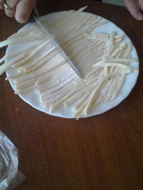 Для пробы решила замесить тесто на 1 яйцо, т.е. количество муки делим на 3. Муки оказалось много, поэтому добавила еще 1 яйцо. Замесила тесто, как пельменное. Раскатала, нарезала.
