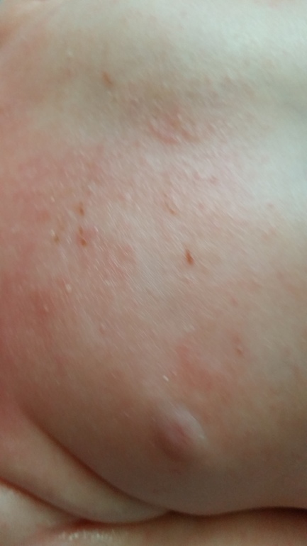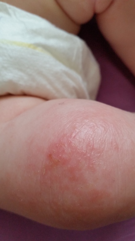 Что у ребенка сейчас с кожей можно увидеть ниже на фото,описываю на словах: краснота,зуд,шершавость,в складках уже сильные покраснения, хотя месяц назад этого не было,только сухость и краснота. Но самое страшное: он все чешет. Чешет и в царапках,и без,до крови может натереть и растереть. Любимые места: колени,грудь и область вокруг ушей. Страшно смотреть.