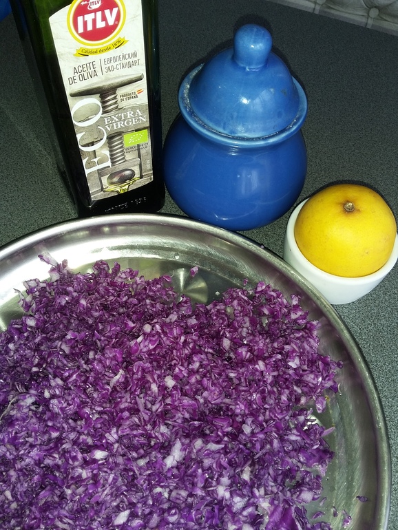 Добавить соль, сахар, оливковое масло первого отжима, каплю лимонного сока (опционально):