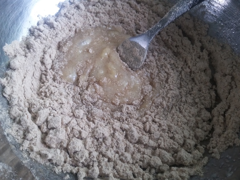 В теплую подсоленную воду вылить настой семян льна, перемешать. Добавить льняную муку: