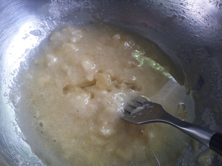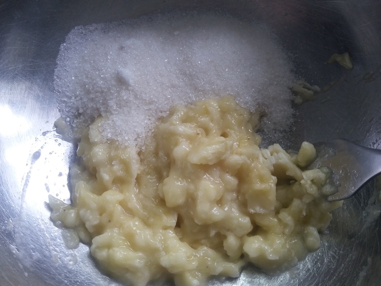 Размять вилкой 1 банан. Добавить 2 ст.л. сахара: