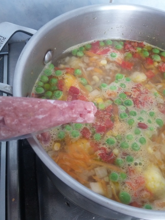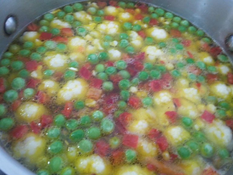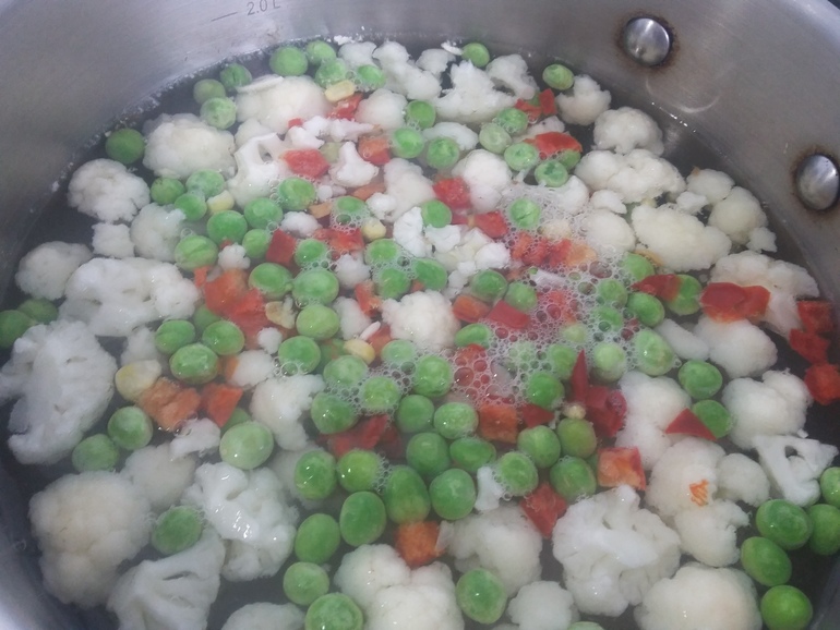 Положить в кастрюлю цветную капусту, замороженный горошек, кукурузу, болгарский перец: