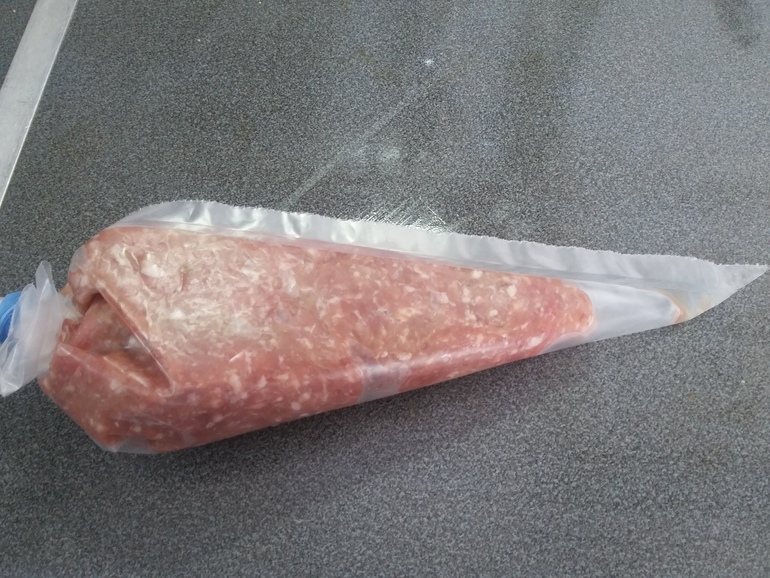 Добавить соль, взбить блендером. Переложить фарш в кондитерский мешок: