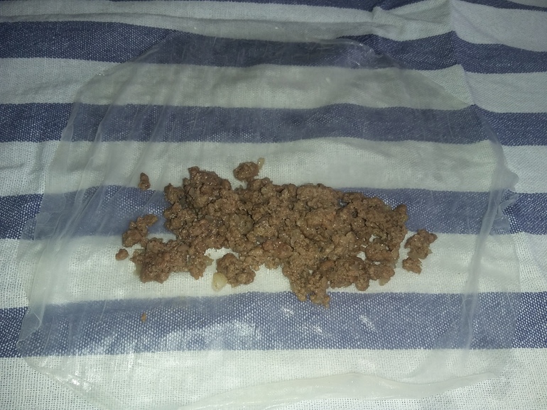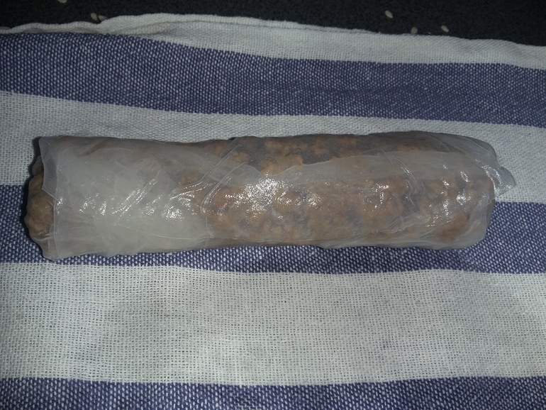 Положить на полотенце. Выложить 1 ст.л. начинки: