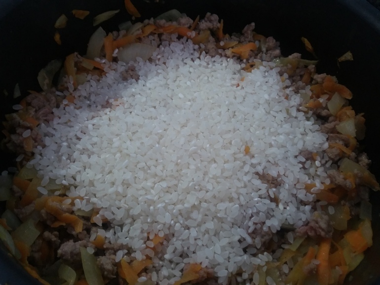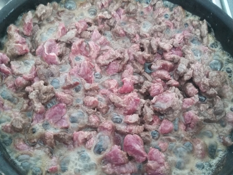 Добавить в сотейник мясо, посолить и обжарить, разминая комочки: