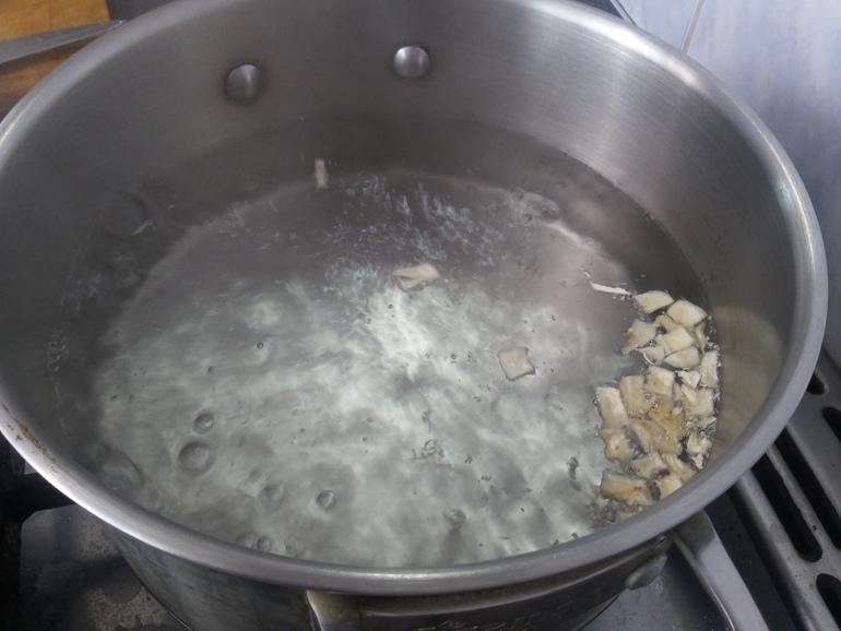 Кипящую воду подсолить, добавить корень петрушки и пастернака: