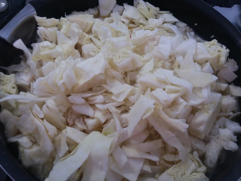 Готовить примерно 10 минут. Положить нашинкованную (или натертую на крупной терке) капусту: