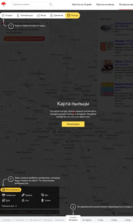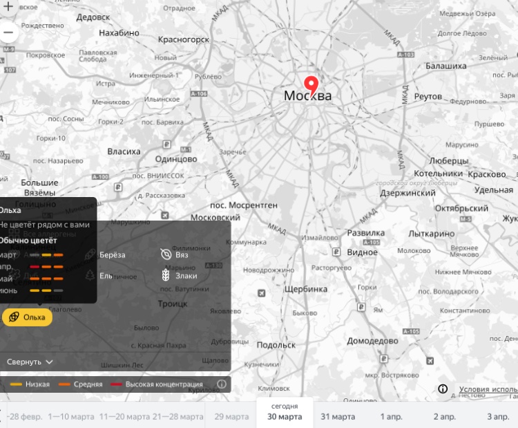 При построении прогноза учитывается множество аспектов. Период и продолжительность цветения регулярно пересчитываются в зависимости от температуры, осадков и направления ветра. Поэтому вся информация о концентрации пыльцы, предоставляемая Яндекс.Погодой, носит справочный характер.»