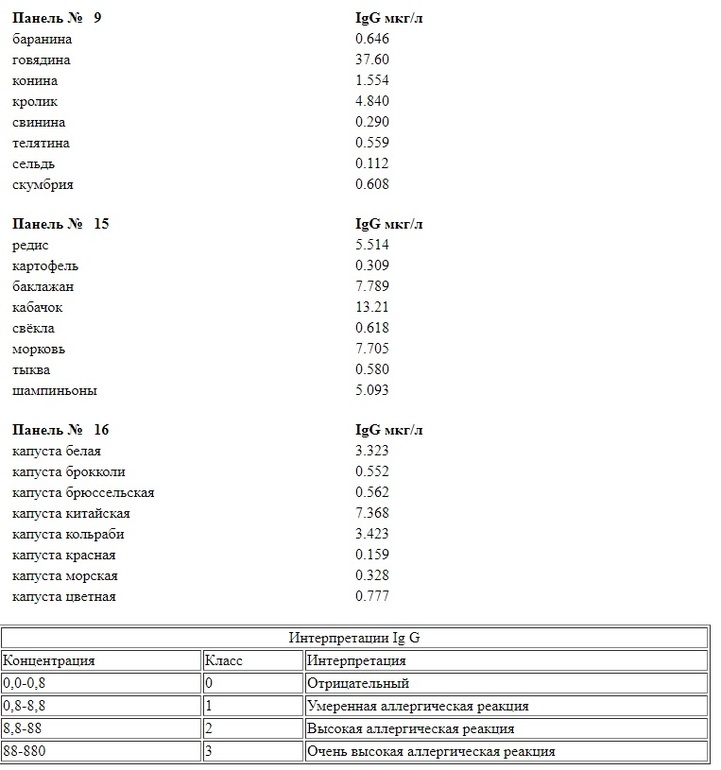 Еще сдали IgG. К сожалению, IgG4 в Беларуси я не нашла. Как я поняла из прочитанного, IgG больше показывает замедленную накопительную реакцию. Может, именно IgG нам и был нужен, если учесть, что быстрых реакций я пока не наблюдала...Но как оно на самом деле я не знаю. В любом случае, сдали, что было возможно.