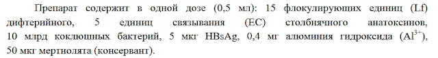 В одной прививочной дозе (0,5 мл) препарата содержится 15 флокулирующих единиц (Lf) дифтерийного анатоксина, 5 единиц связывания (ЕС) столбнячного анатоксина, 10 млрд коклюшных микробных клеток,не более 0,55 мг алюминия гидроксида и не более 50 мкг формальдегида. Консервант - мертиолят от 42,5 до 57,5 мкг.