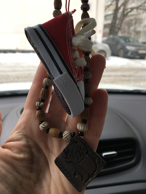 У меня деревянный талисман, привезённый из Индии кочует из машины в машину...