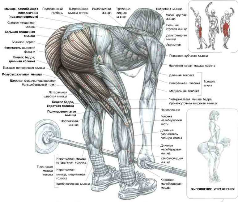 Помимо основной целевой мышечной группы - задней части бедра, данный вид тяги отлично нагружает ягодичные, икроножные, поясничные и мышцы трапеции.