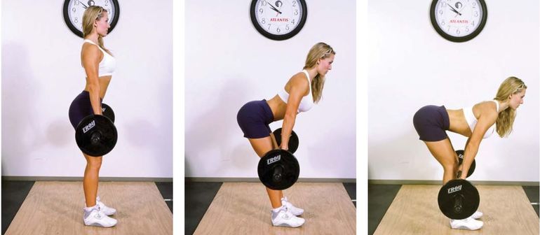 Исходное положение: гантели на полу, симетрично, на одном расстоянии; ноги на ширине плеч, колени слегка (!) согнуты. На вдохе прогнитесь в пояснице и наклоняйтесь, держа ноги прямыми. Возьмитесь за гантели прямым хватом, т.е. ладонями, обращенными вниз. Равномерно поднимайте гантели, делая выдох. При этом руки должны быть прямыми, спина - прогнутой в пояснице, ровной, а сами гантели должны находиться как можно ближе к ногам. Вдохните и, выпрямив туловище, на выдохе наклонитесь и опустите гантели до середины голени. Движение должно быть медленным и ровным. Сделайте необходимое количество повторов.