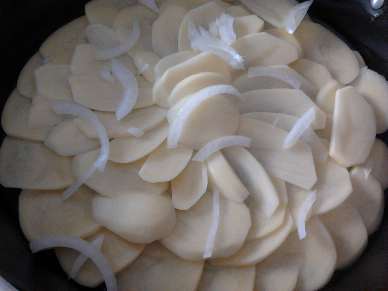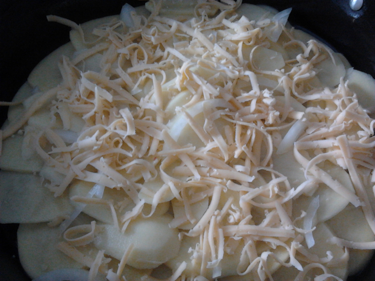1. Тонко нарезать картофель ломтиками и аккуратно выложить тонким слоем на противень, накрыть слоем порезанного кольцами лука и посыпать сыром (Чеддером). Повторить необходимое количество раз, последний слой должен быть сырным.