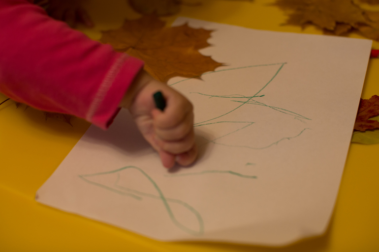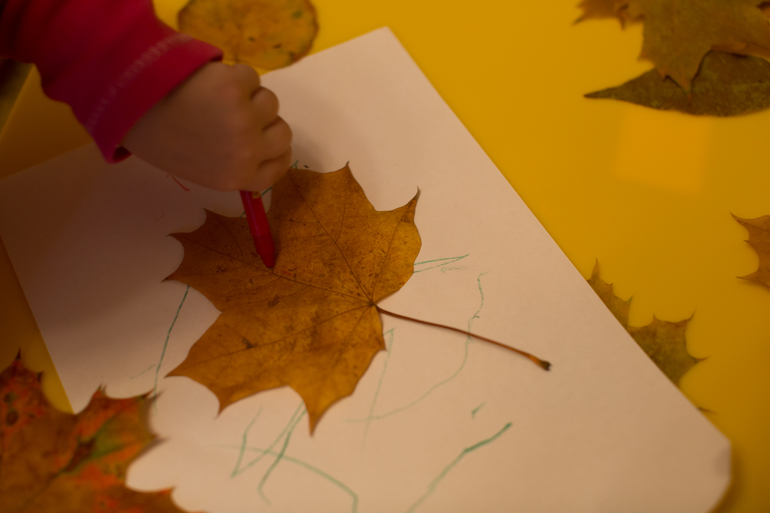 Итак, сначала берем осенние листики и обводим по контурам восковым мелком.
