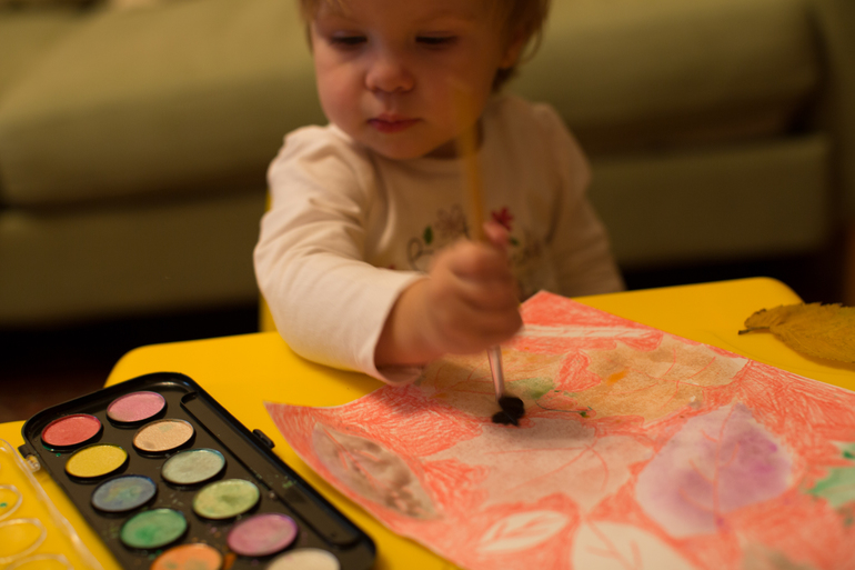 А потом раскрашиваем акварельными красками наши листики. Я решила, что Катюша закрасит мой рисунок. С этим заданием справится даже годовалый малыш: краска не воск не берется, закрашиваются только белые осенние листики, которые, благодаря краскам начинают играть всеми цветами радуги.