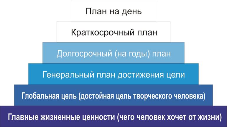 Жизненные ценности человека определяют его глобальную цель, и конечно же для достижения цели у вас должен быть план (на 3 года, 5, 10 лет), а уже потом план на год, месяц, неделю, день. Если вы еще не определились, какие жизненные ценности для вас приоритетны, загляните сюда.