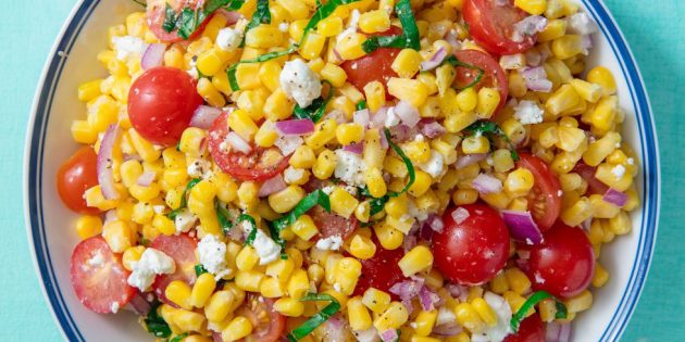 Смешайте кукурузу, разрезанные пополам помидоры, раскрошенную фету и мелко нарезанный лук. Добавьте листья базилика, нарезанные тонкими полосками, масло и сок целого лайма. Приправьте специями и перемешайте.