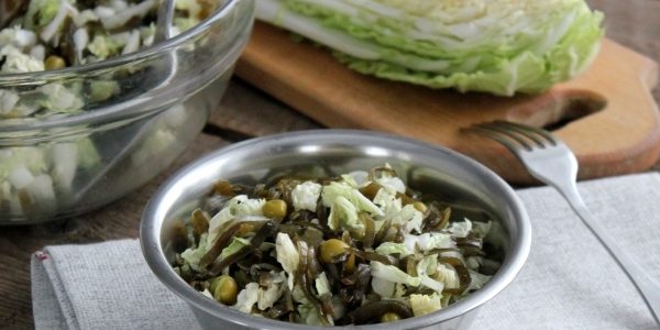 Нарежьте пекинскую капусту небольшими полосками. Смешайте её с горошком и морской капустой, предварительно слив с них жидкость. Заправьте салат маслом.