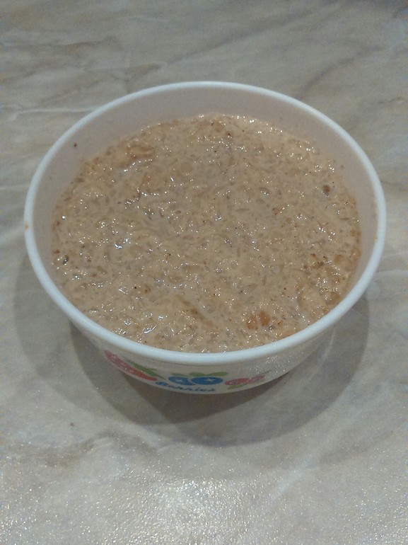 Завтрак: всегда каша молочная (1:1 с водой), 150 г. Стараюсь уже не блендерить сильно, или варить хлопья. Омлет, запеканки нам нельзя из-за аллергии на яйца, надеюсь после года перерастем ее..