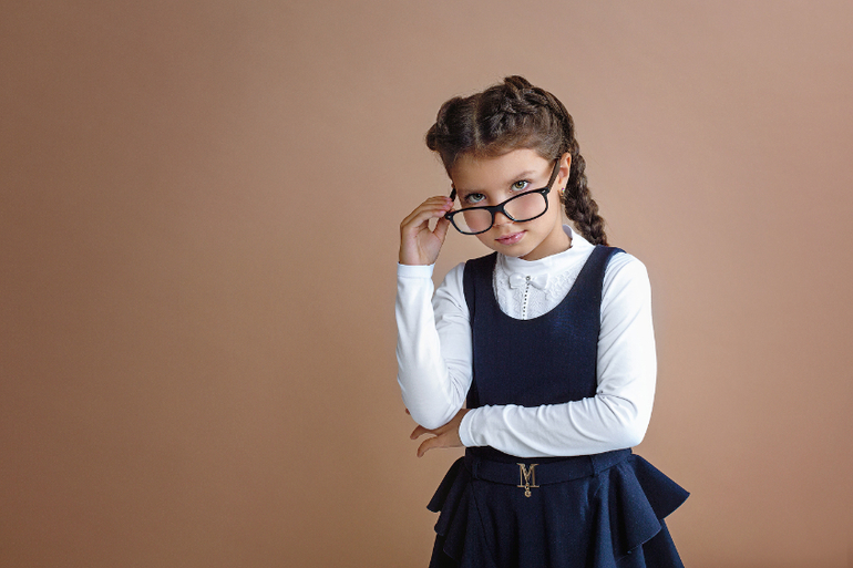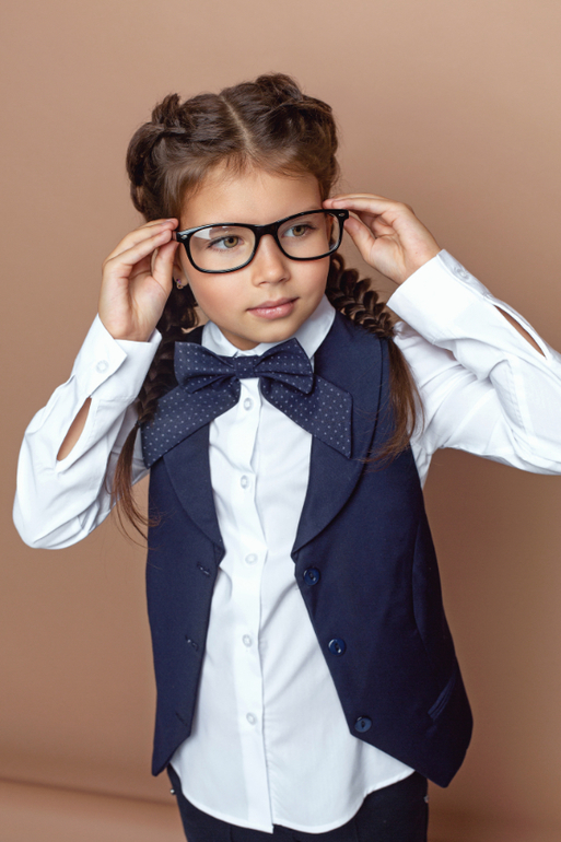 Не обязательно на фоне школы, но атрибуты школы хорошо бы смотрелись. Здесь кроме взрослых очков и неестественных эмоций нет ничего. Но это дело ваше, вы художник и вы так видите ))