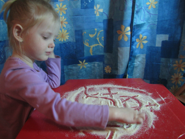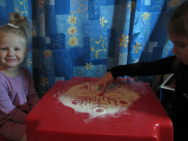 Лера дает мастер -класс по рисованию снежинок на песке....