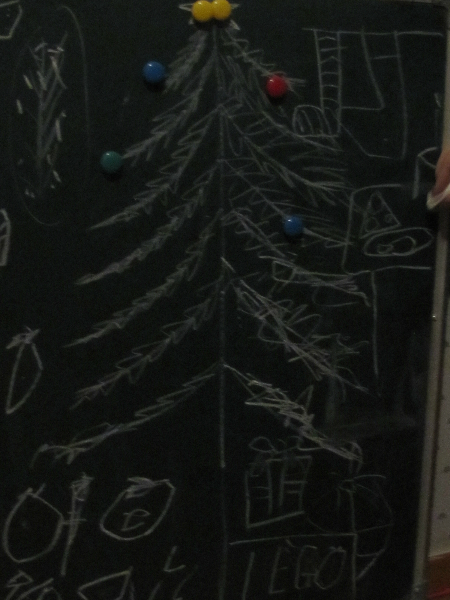 Лера нарисовала елочку и Соня помогла дорисовать иголочки. Затем мы украсили нашу елочку магнитами-игрушками, и девочки нарисовали подарки, Соня зачем то нарисовала фрукты.... с ней так всегда-постоянно думает о еде.