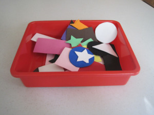 4) The foam shapes also work well as inexpensive pattern blocks. Sit with your child and work to build 2-dimensional objects. For instance, ask your child to help you use the shapes to make a house, car, train, etc… You can use a picture book or magazine to start, as well, and ask your child to select shapes that they see in the pictures and place them in the corresponding spot. For instance, an ad of a home in a magazine has square windows. Therefore, you select a square and place it onto the window. Some of your child’s selections may be arbitrary or not fit well, but go with the flow. Their minds is at work as long as they are actively participating. There is no right or wrong selection.