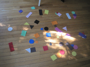 3) If you have many children desiring to play (or needing to be entertained), throw the shapes on the floor, spread out so they are not piled on top of each other. Be sure there is plenty of space between each shape. Call out a color or shape and have the kids run and put their foot on one. Remind them that only one foot can be on one shape at a time. For example, “Everyone find a circle!”. Or, “Now, find a green shape.” At some point, make them laugh by calling out a shape and color that you don’t have out on the floor. Allow children to be in charge of calling out the shape or color of a round.