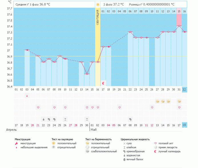 Ура! Мой график беременный!Первый раз в жизни решила мерить БТ.Первая фаза была высоковатой.Боялась,что О не случится,а когда увидела,что полнялась она с 36,8 до 37,1 - рассторилась,что такой маленький подъем.Даже мерить расхотелось.Потом через 3 дня решила снова проверить- и уже поднялась повыше.Тогда я успокоилась и появились надежды...В прошлом цикле овуляции не было,т.к. пила прогинову и утрожестан.Своей овуляции не было давно,а тут вот - Бог подарил нам вот такое чудо))Всем хочушечкам желаю поскорее достигнуть своей цели и дождаться рождения своего маленького счастья!!!