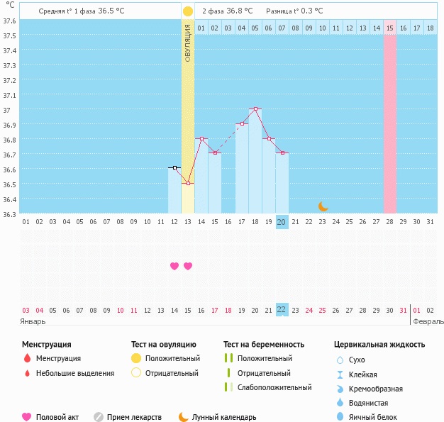 На 12 ДЦ фоллик был достаточно большой и узистка сказала стараться в ближайшие 2 дня, а на следующий день у меня тянуло низ живота и хотелось, извиняюсь за подробности, секса. Поэтому О в графике поставила сама. Вопрос вот в чем, раньше измеряя БТ на протяжении года, БТ в 1-ой фазе была от 36,4 до 36,6, а во 2-ой фазе иногда поднималась постепенно, иногда резко, но держалась в пределах 37,0 - в первые дпо и 37,1-37,2 до 12,13дц. А теперь наблюдается такая картина, сразу после О t постепенно поднялась, но вот вчера и сегодня очень низкая. Прошу вашей помощи, т.к. никогда такого не было