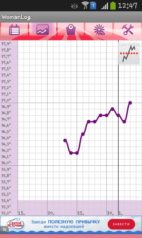 Беременность, признаки по БТ, есть ли шанс?Девочки!помогите разобраться...у всех беременяшек было западение на графике?у меня,сегодня произошло,и темпа стала 37.0,последняя была 36.7....как расценивать данный результат?тут график не веду.стала мерить с 19 дц,сегодня 30 дц... что посоветуете?