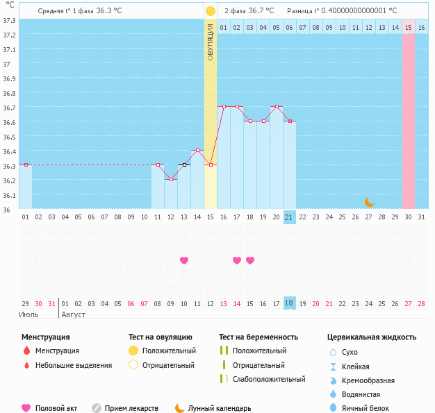 цикл у меня тьфу тьфу как часы , день в день, честно говоря и без измерений понимаю, когда овуляция живот жутко болит в этот день, но я измеряю для того чтобы посмотреть как себя ведет температура в течении всего цикла, а она зараза всегда как под копирку одно и тоже из цикла в цикл, низкие темпеературы , меня это и пугает. девочки, вы меня щас немного успокоили если честно , спасибо!!