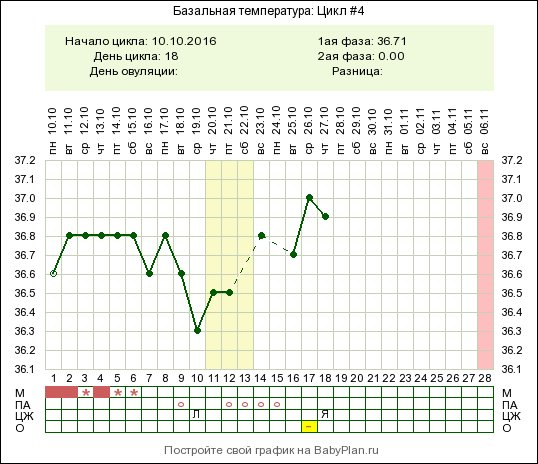 Жалко, конечно, что в период вероятной о пропущены значения, они важны. Но тут вот по графику я б на 16дц предположила О. 36.8 к вас и для первой фазы норм температура.