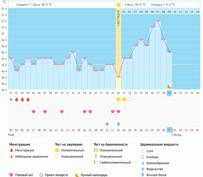 Добрый день.У вас по графику падение бт резкое было,вы в этот цикл забеременели или пошли М?У меня вот сегодня такая же картина,с 37 упала резко 36,5(((только 18дц просто...не знаю,чего и ждать.или сбой или м раньше придут(