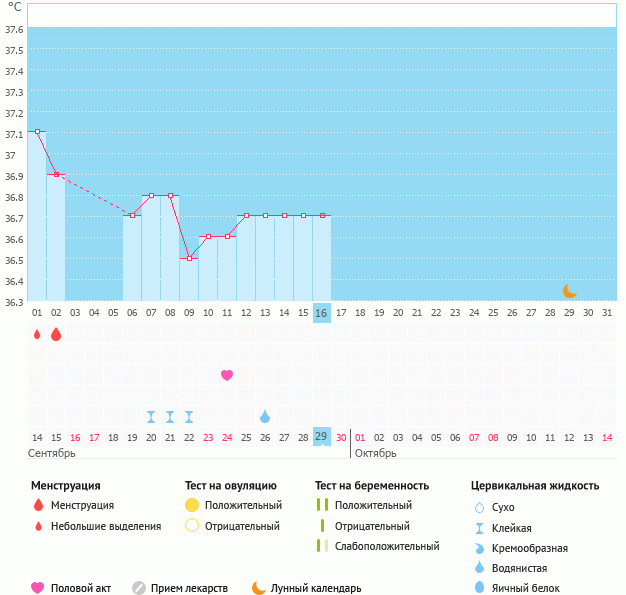 График вот такой получился. Я все таки думаю в этом цикле О не было, потому что уже сегодня мажет, завтра полноценные М начнутся. Для второй фазы слишком мало. Вот если бы цикл 32 дня был, то да, я бы согласилась, что О была. А вам желаю удачи!