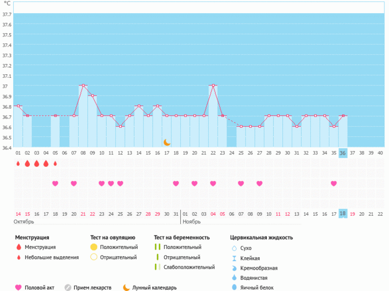 Мой график базальной t°, цикл от 23 октября 2017 Мой график базальной t°, цикл от 6 ноября 2017