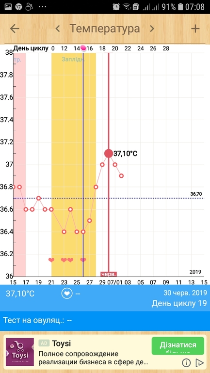 График веду на протяжение 4х месяцев. Во второй фазе ниже 37 бт не падала, только за 1-2 до М. Надеюсь, что это ТО, о чем мечтаю. Но все равно поехала сдавать прогестерон, сегодня как раз 22 ДЦ